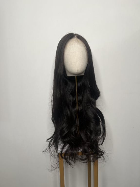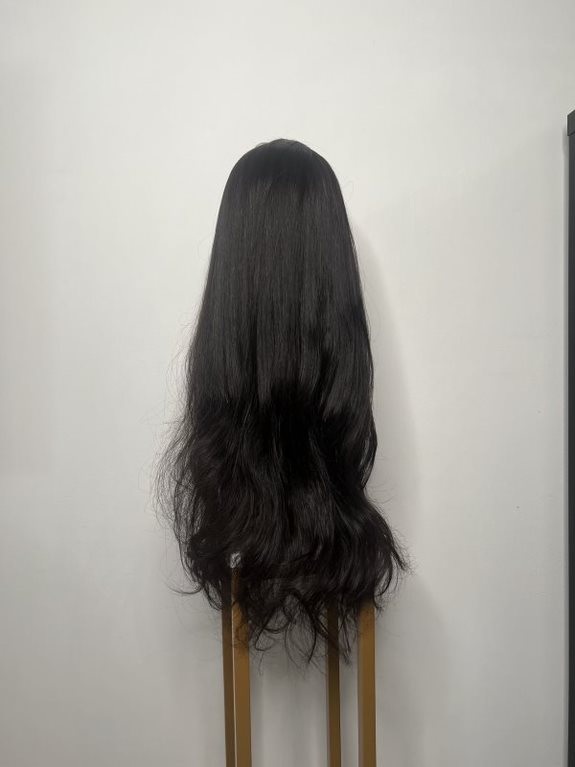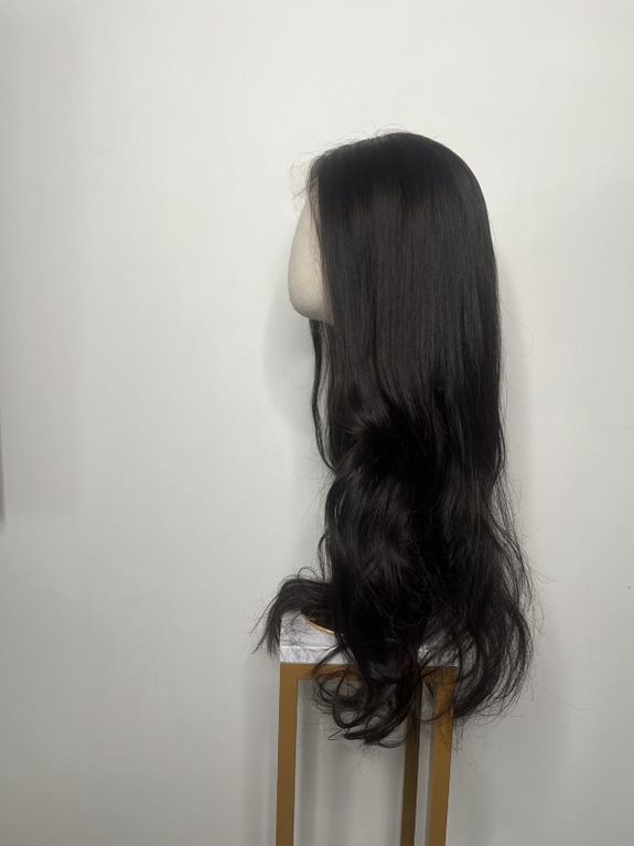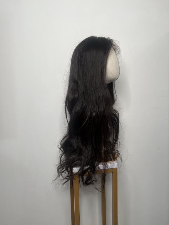 Perruque de 65cm avec 430grammes de cheveux, couleur naturelle chatain fonce avec une frontal de 13×4, taille du bonne M.